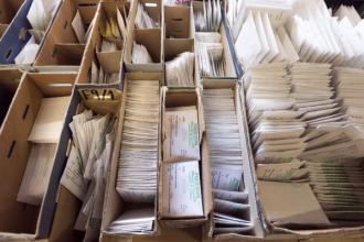 Packets of seeds on a table at Fedco's warehouse in Clinton. The Maine-based cooperative sells a wide variety of seeds, bulbs, trees and soil amendments and it is owned by its employees and customers.
